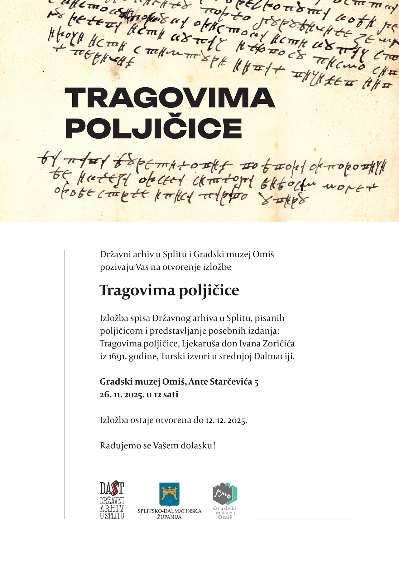 “Tragovima poljičice” je izložba koja vodi kroz bogatu povijest poljičice, inačice hrvatske ćirilice, kao neizostavnog dijela kulturnog identiteta srednjodalmatinskog kraja. Bit će izloženi dokumenti sačuvani kroz više fondova i zbirka, nastali u vremenu od 17. do 19. stoljeća.