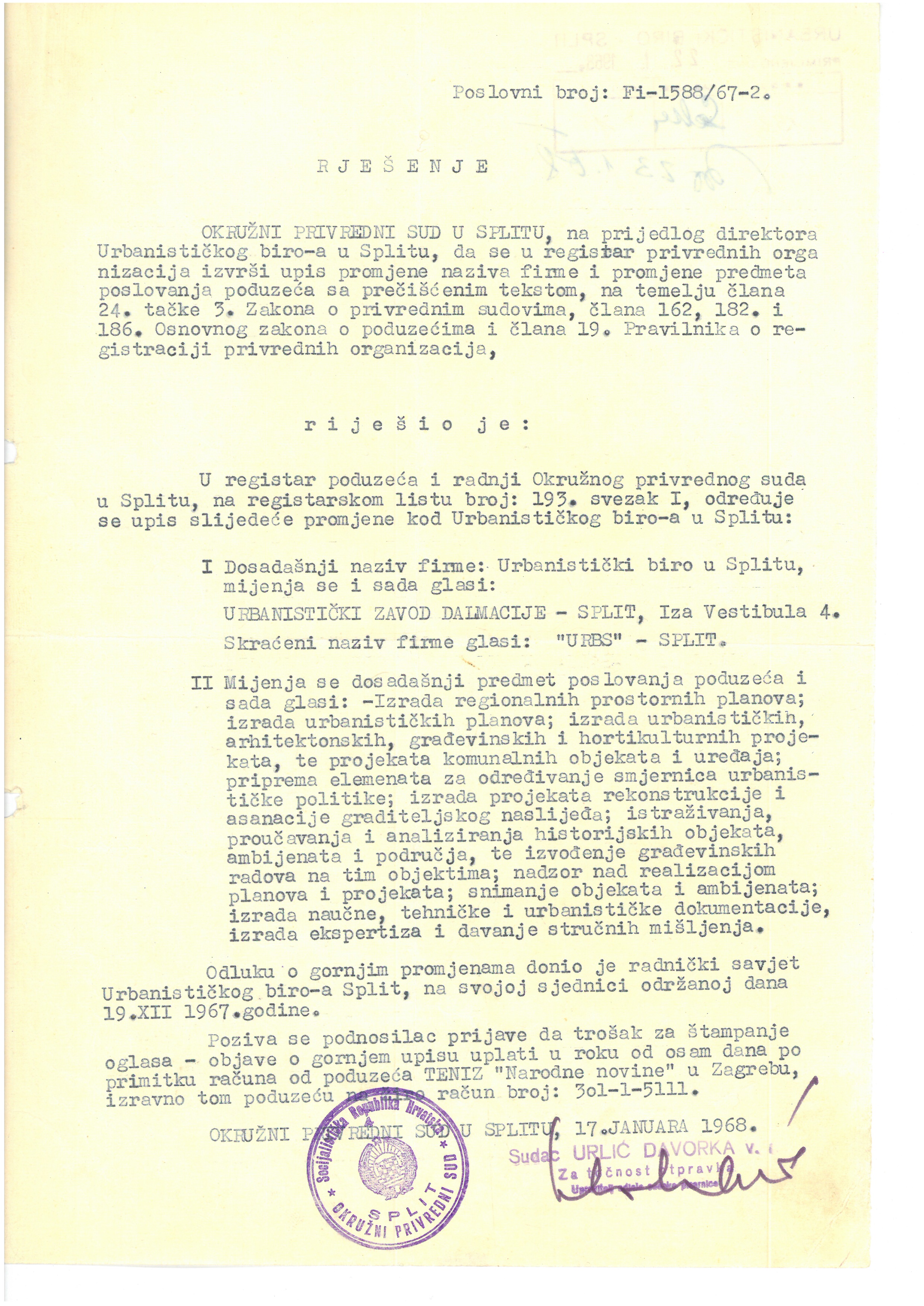 Spis poslovnog broja Fi-1588/67-2 kojim Okružni privredni sud u Splitu prihvaća promjene koje je predložilo poduzeće i registrira ga s nazivom Urbanistički zavod Dalmacije – Split, skraćeno URBS – SPLIT, pod kojim zavod djeluje od 1968. do 1993. Odluku o promjeni statusa u samostalnu ustanovu donosi Radnički savjet na referendumu održanom krajem 1966. Okružni privredni sud početkom 1967. odbija registrirati poduzeće zbog prigovora tada još postojećeg Urbanističkog zavoda kotara Split. Sljedeće godine navedenim spisom Sud prihvaća predložene promjene. Spis je dio fonda HR-DAST-119, URBANISTIČKI ZAVOD DALMACIJE – SPLIT, trenutno u postupku arhivističke obrade i sređivanja.