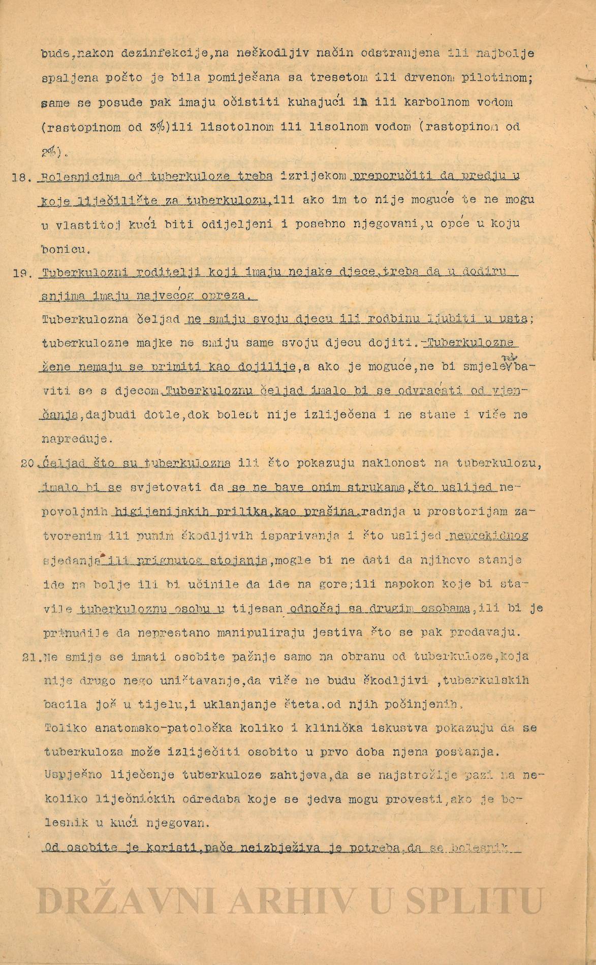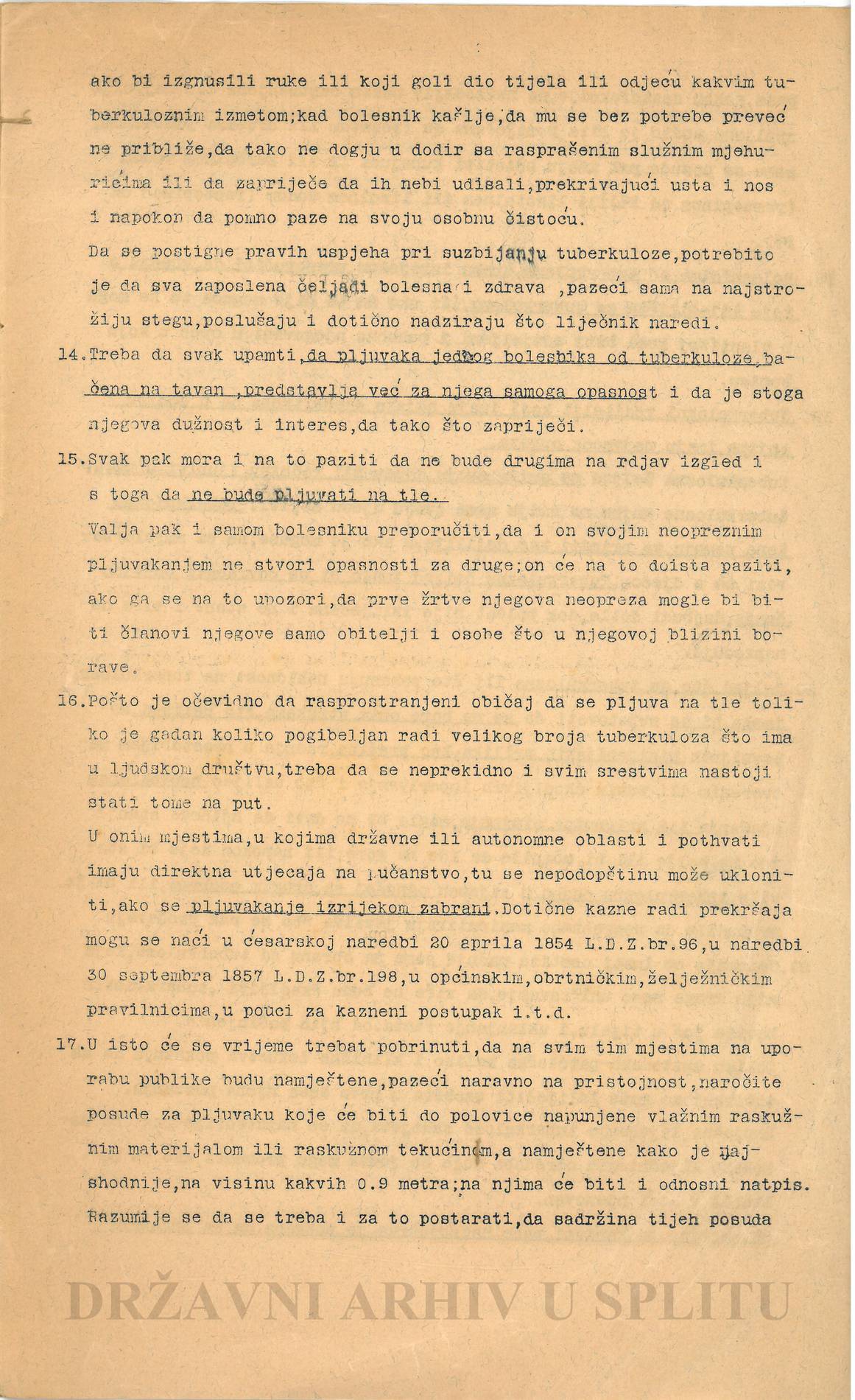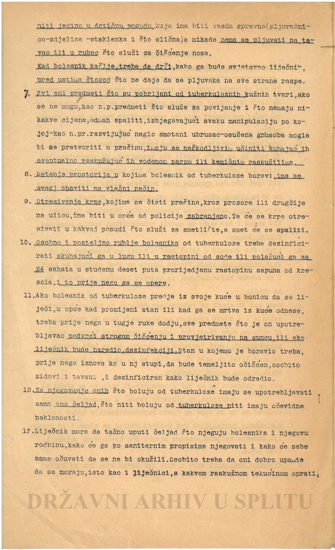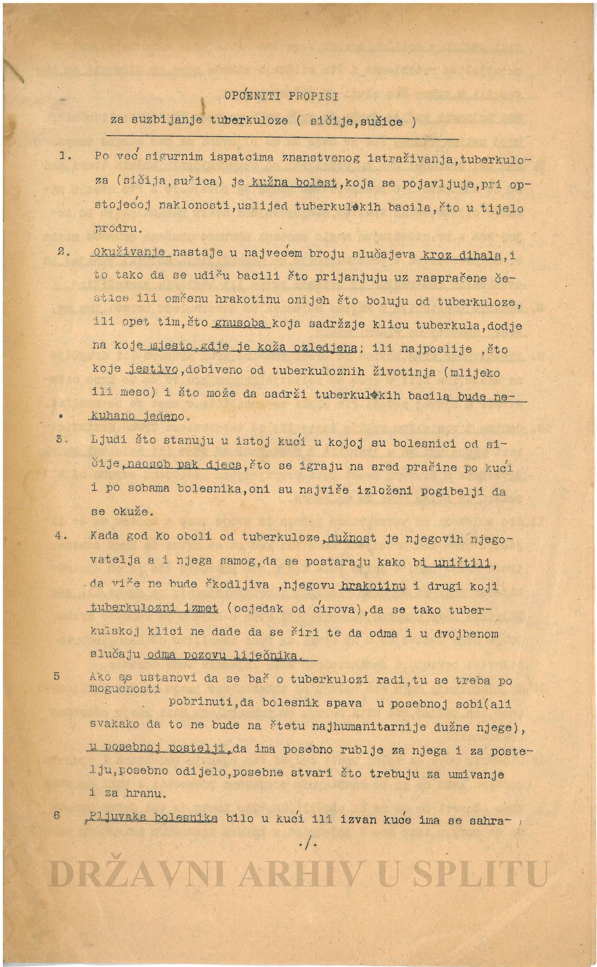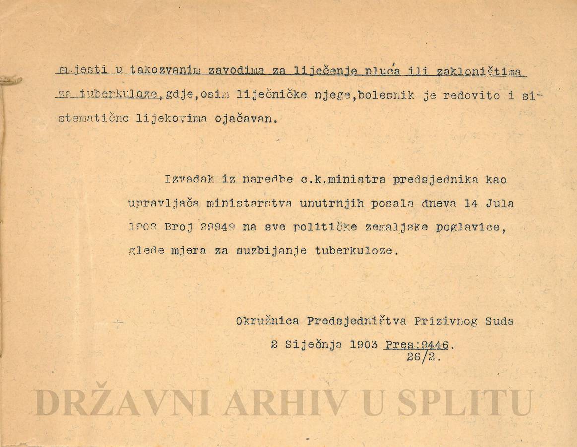 Općeniti propisi za suzbijanje tuberkuloze (sičije, sušice) u Okružnici Predsjedništva Prizivnog suda od 2. siječnja 1903. Pres: 9446. 26/2.