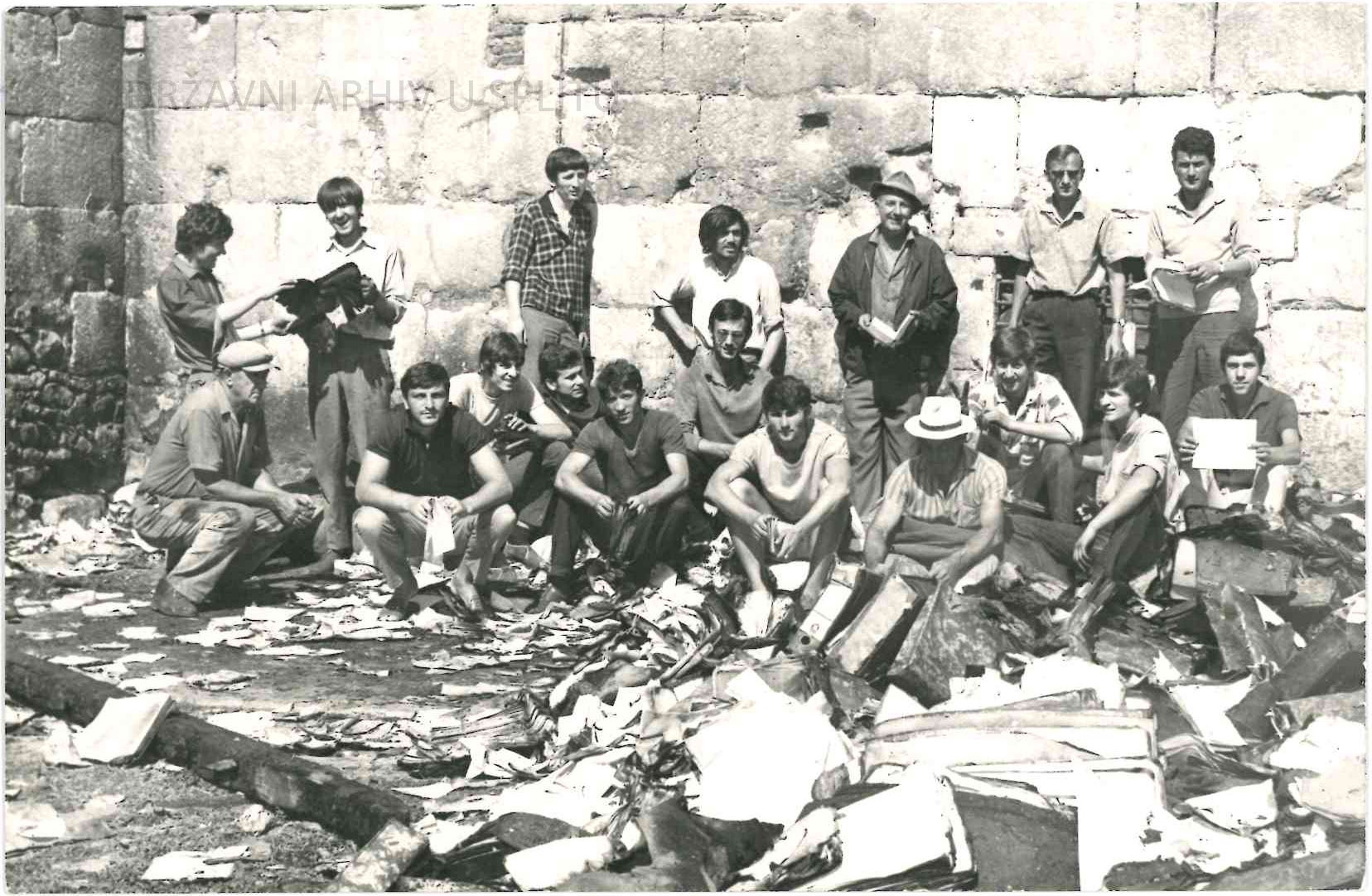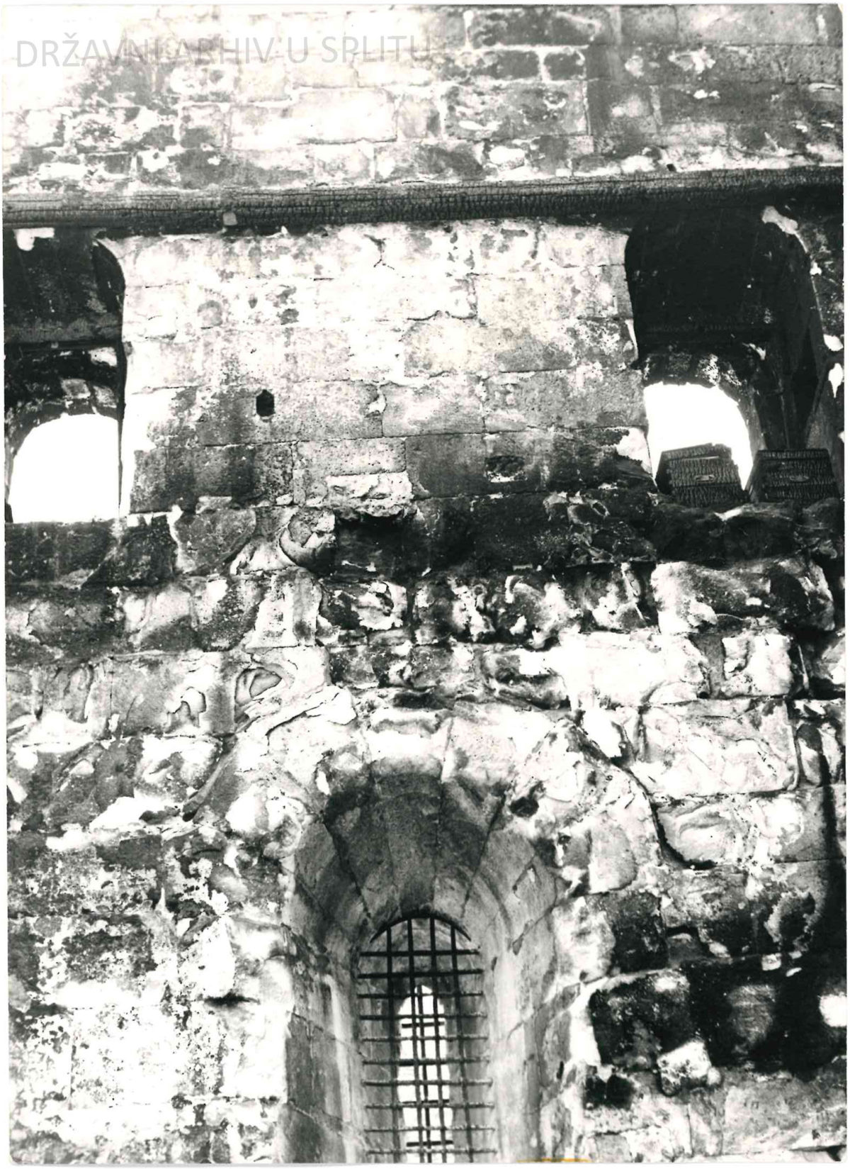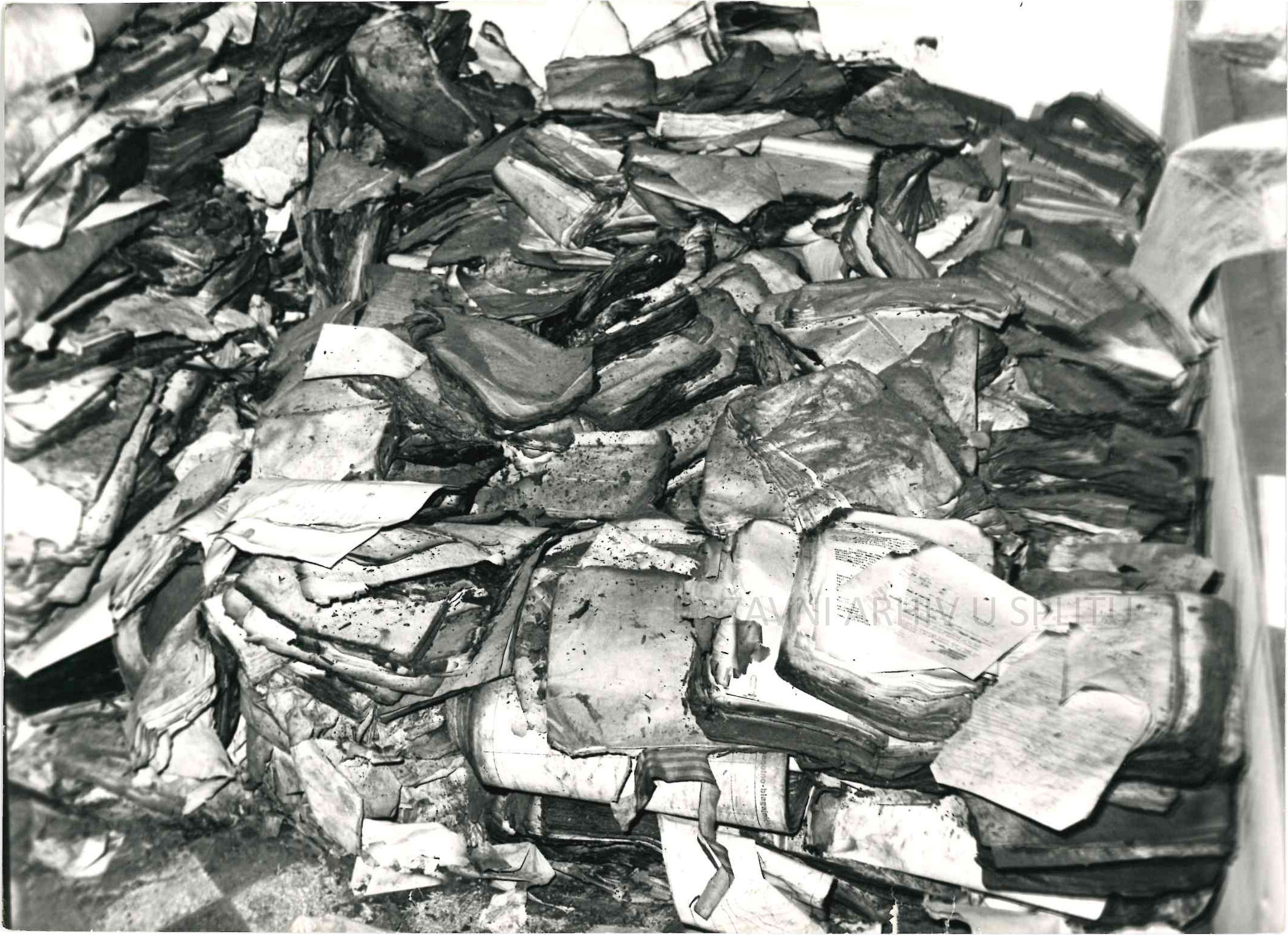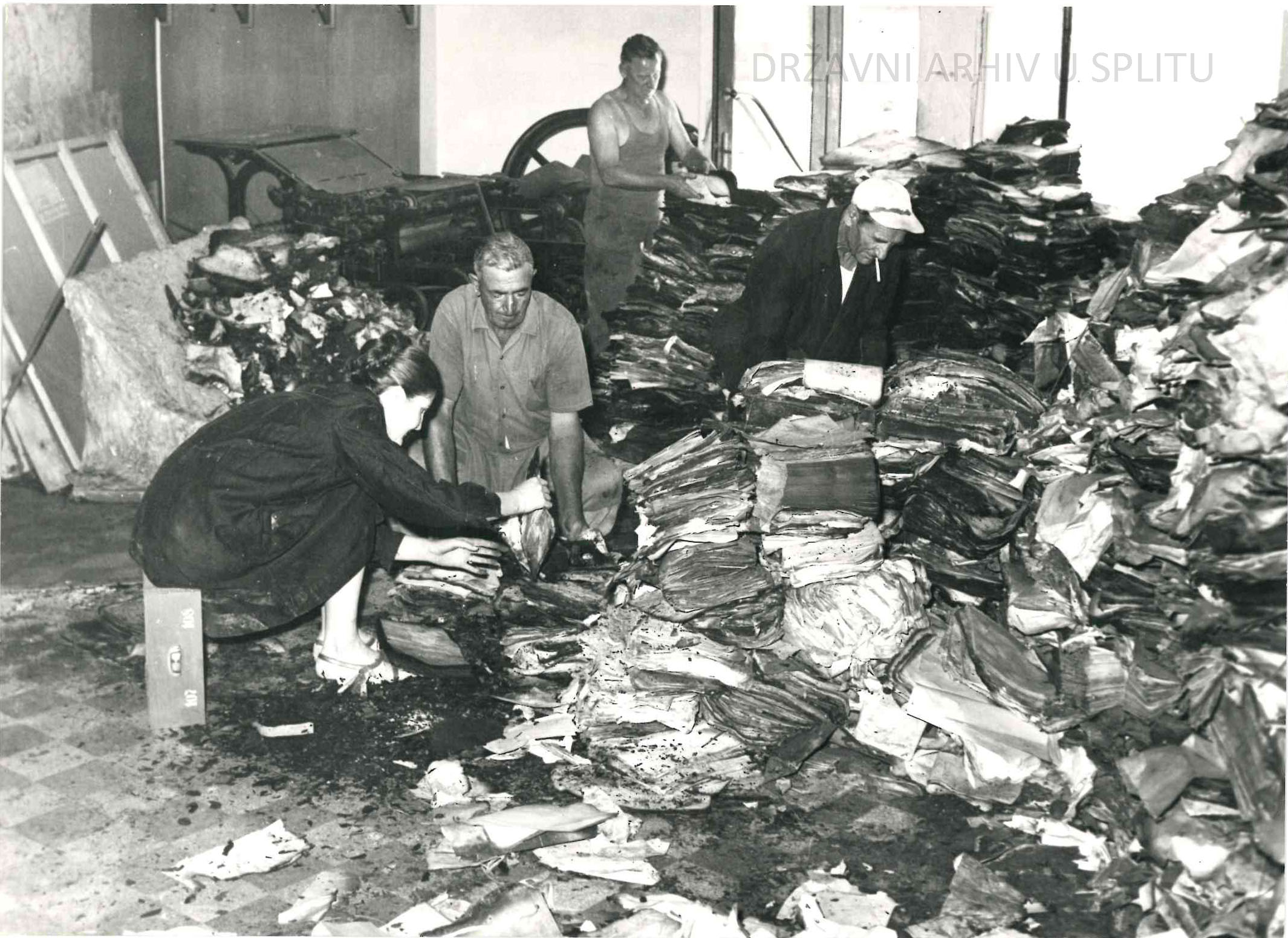 Fotografije na kojima se vidi šteta nastala za vrijeme požara u prihvatnom spremištu Državnog arhiva u Splitu (tadašnjeg naziva Historijski arhiv u Splitu) koje se nalazilo u sjeverozapadnoj (Arnirovoj) kuli Dioklecijanove palače. Požar je buknuo u ranim jutarnjim satima 24. lipnja 1969. g. Nastradalo je dosta vrijednog arhivskoga gradiva, što od požara, što od vode, prilikom gašenja požara. U cijelosti je uništeno 25, a djelomično 28 arhivskih fondova. Stradalo je gradivo privremeno bilo smješteno u zgradi bivšeg suda u Kavanjinovoj ulici, a kasnije je prebačeno u Duhansku stanicu u Trogiru koja je imala komore za sušenje (trebalo je osušiti nagoreno gradivo koje je još više uništeno prilikom gašenja požara). Na spašavanju nagorenog i naplavljenoga gradiva radili su arhivski djelatnici, studenti i tri djelatnika Duhanske stanice.