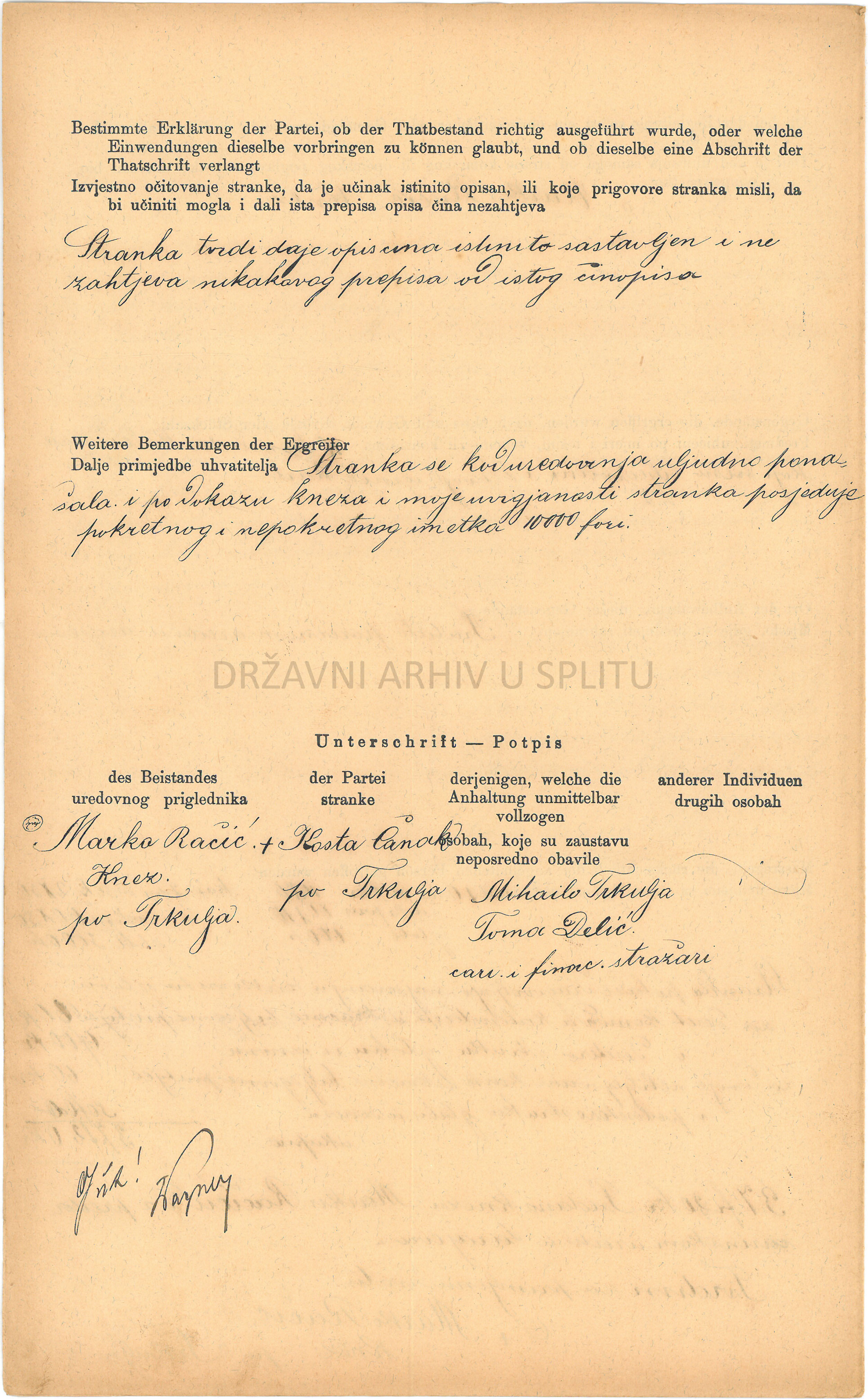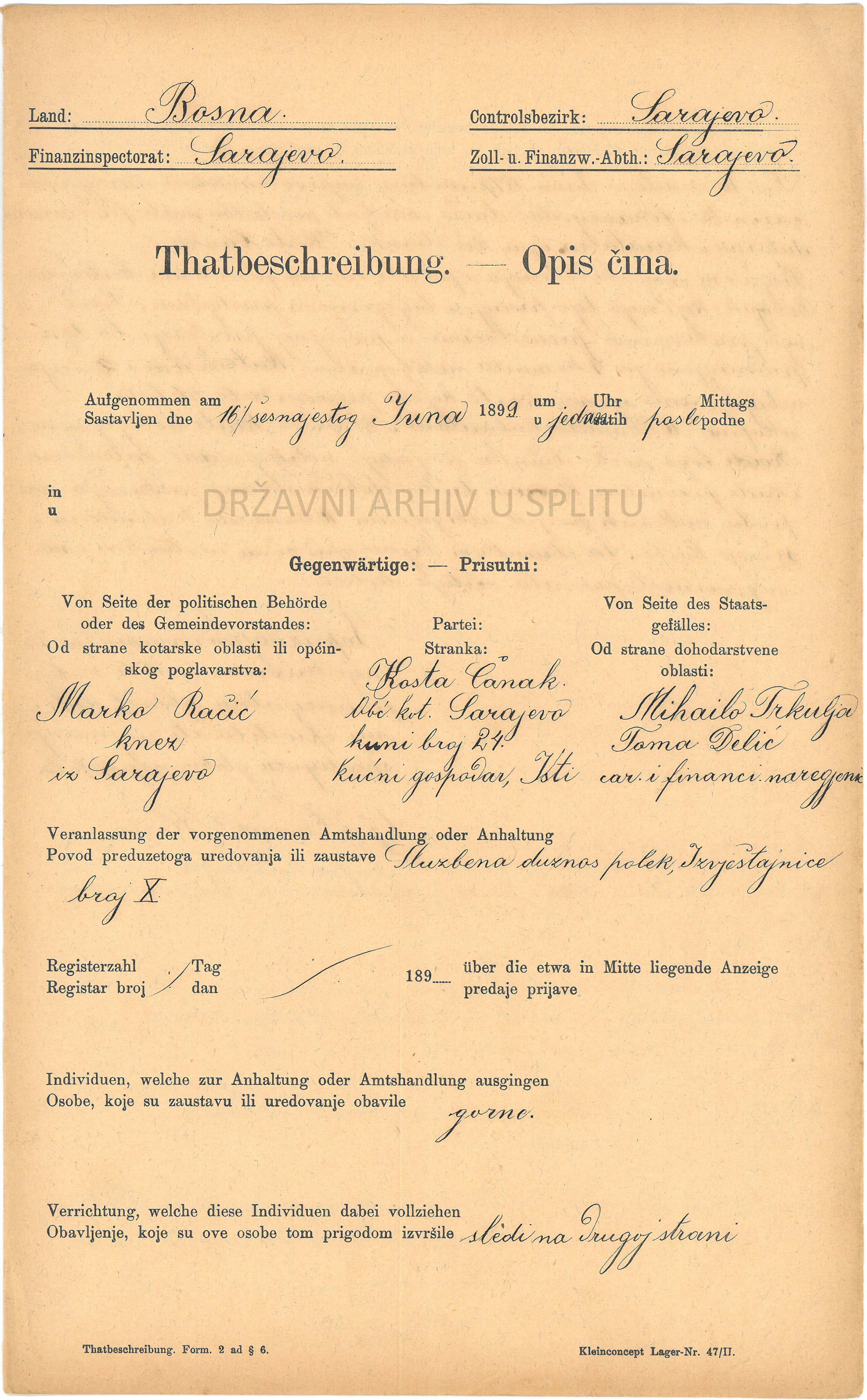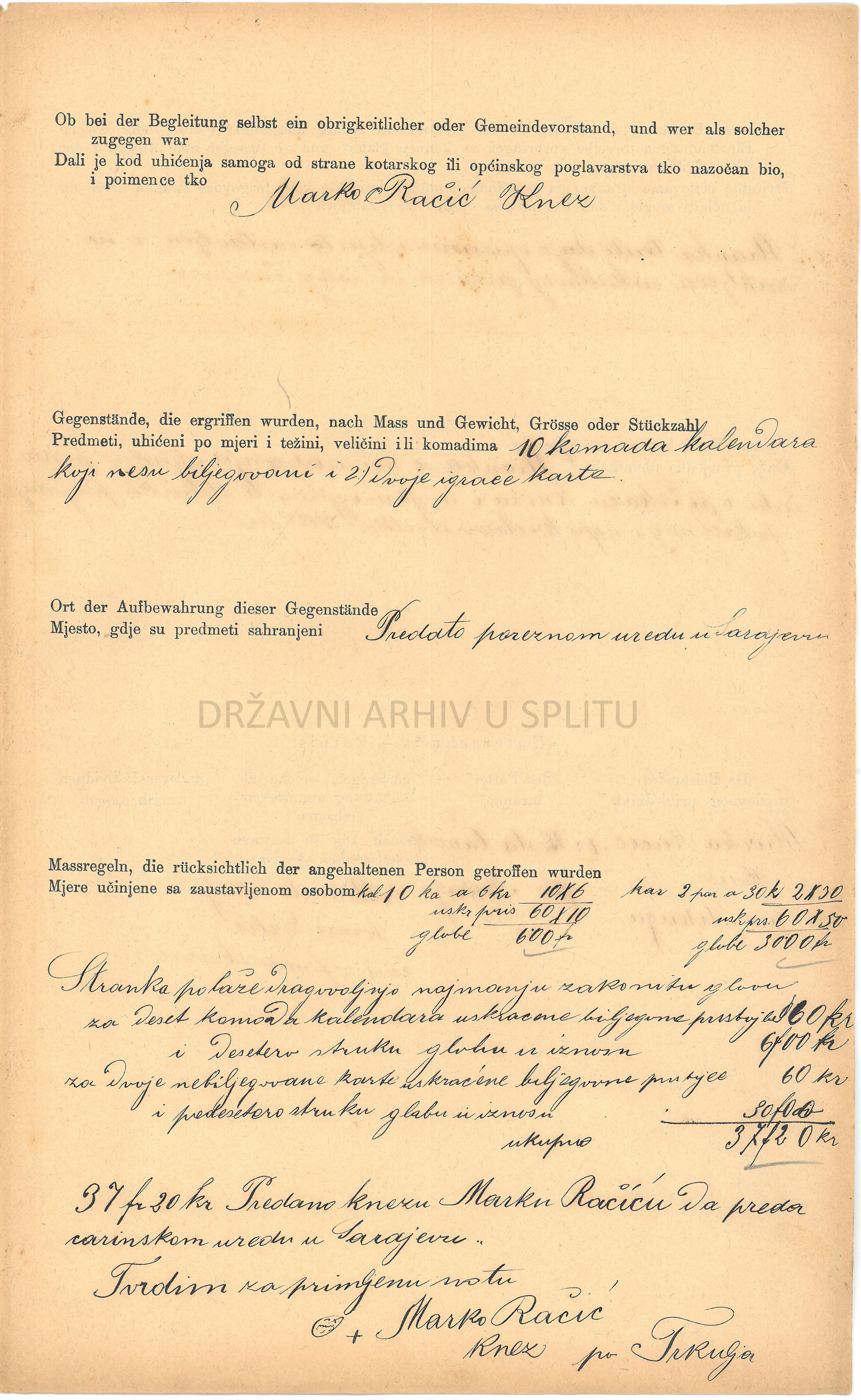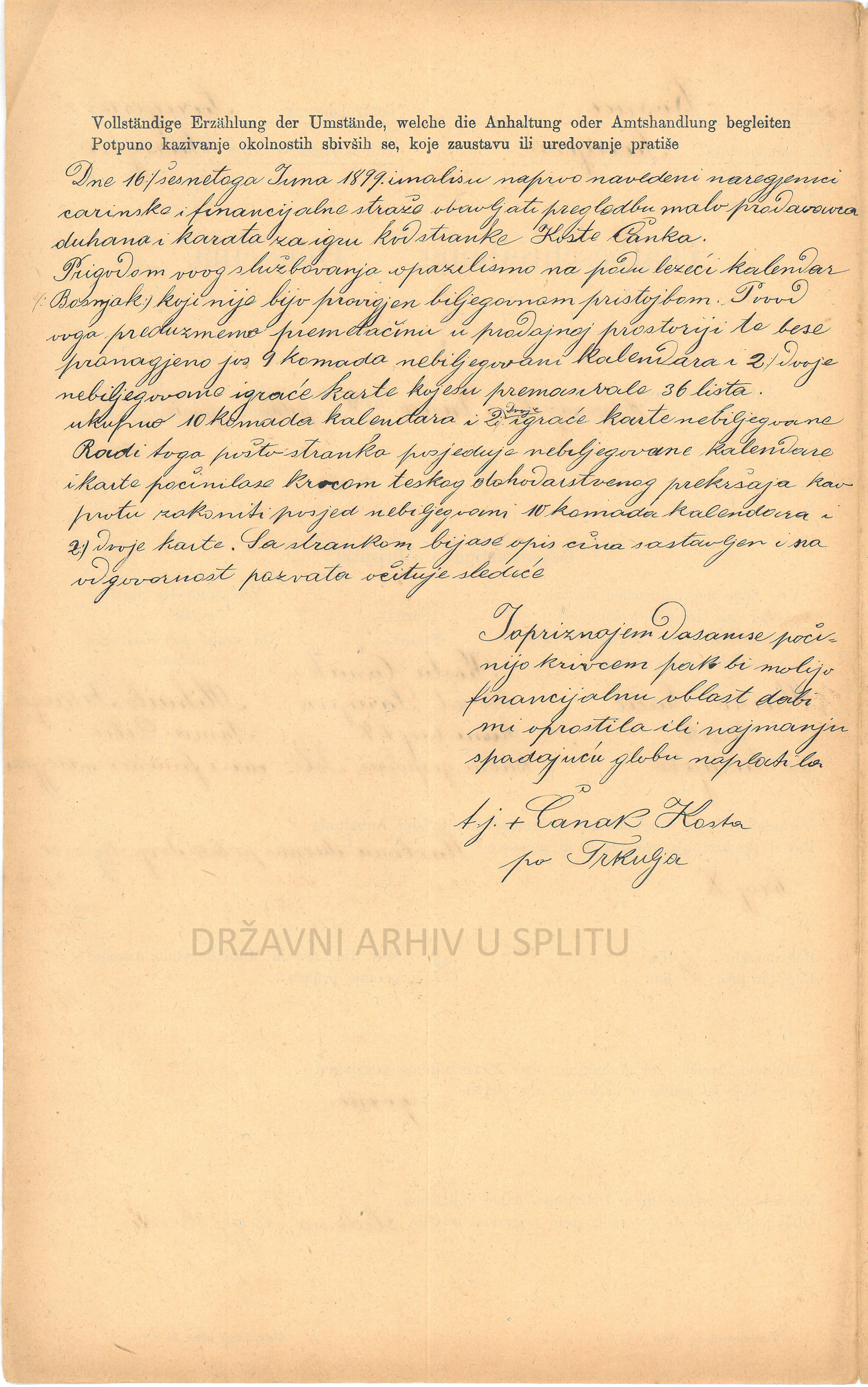 Financijska straža (Finanzwache) je bila institucija koja je u razdoblju Austro-Ugarske Monarhije bila zadužena da pronalazi i sprječava krijumčarenje robe i druge monopolske, trošarinske i taksene prekršaje. Fotografije prikazuju izvještaj o uhićenju Koste Čanka, kojeg se teretilo da je posjedovao 10 kalendara i 2 seta igraćih karata koje nisu imale biljeg, tj. na koje nije plaćen državni porez. Izvještaj opisuje događaj, izjavu optuženog, njegovo ponašanje prilikom procesa, prisutne dužnosnike i izračun kazne.
