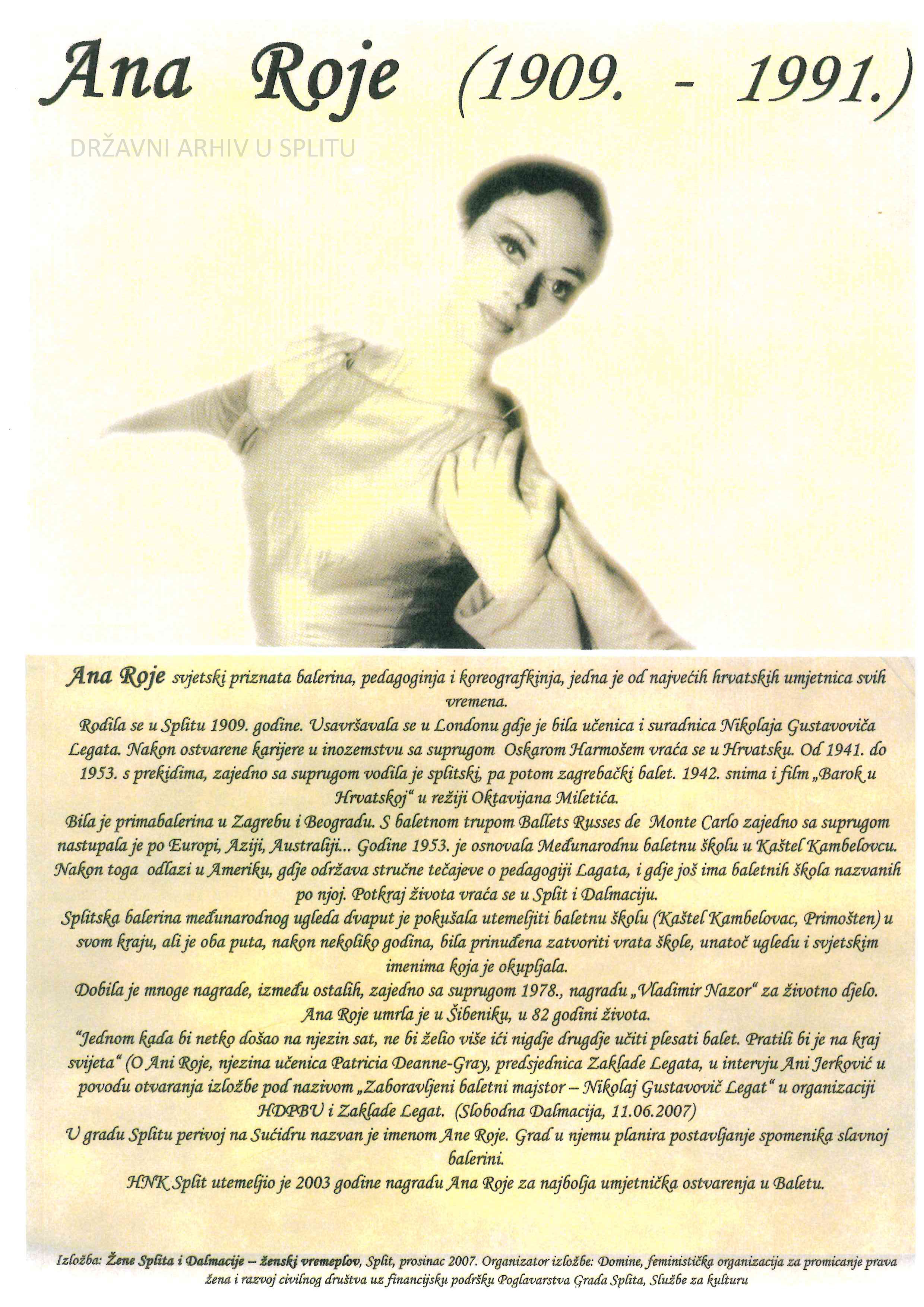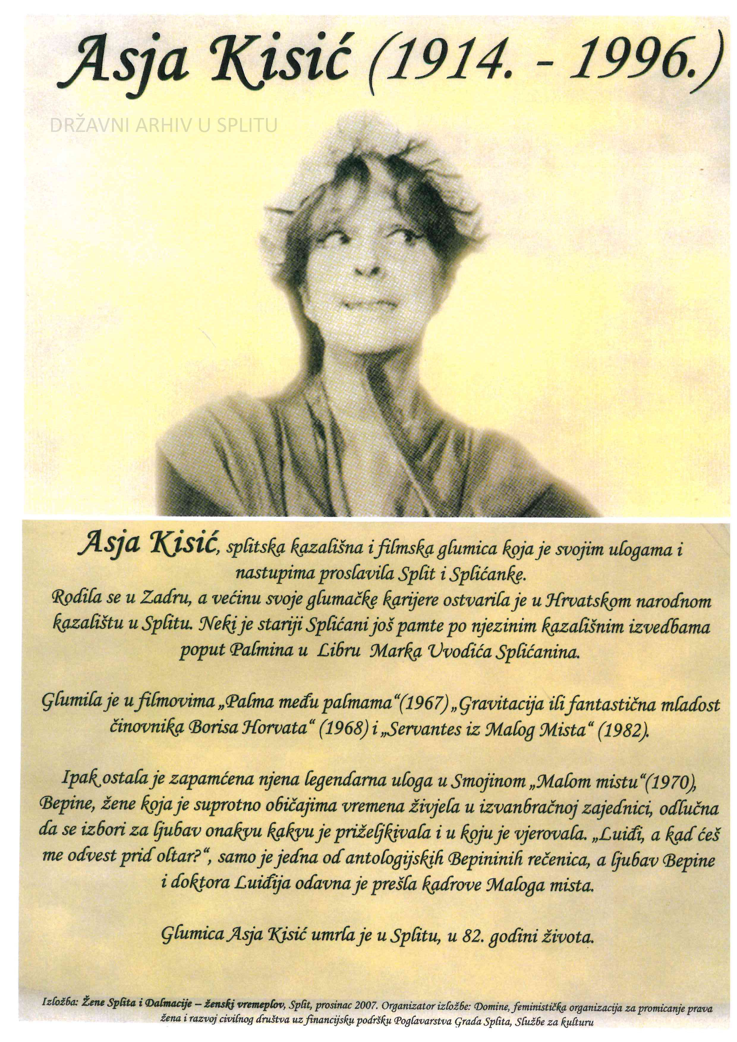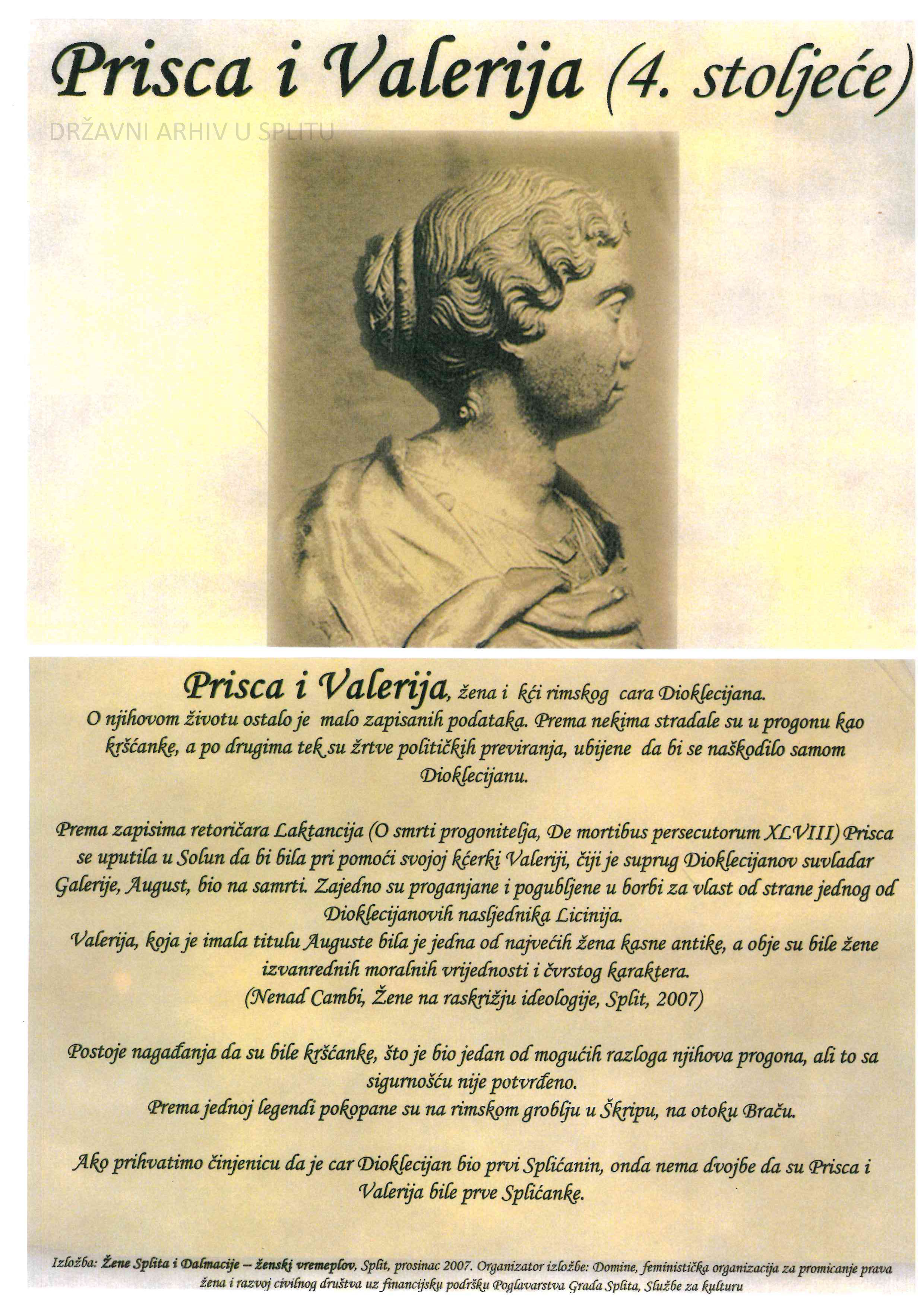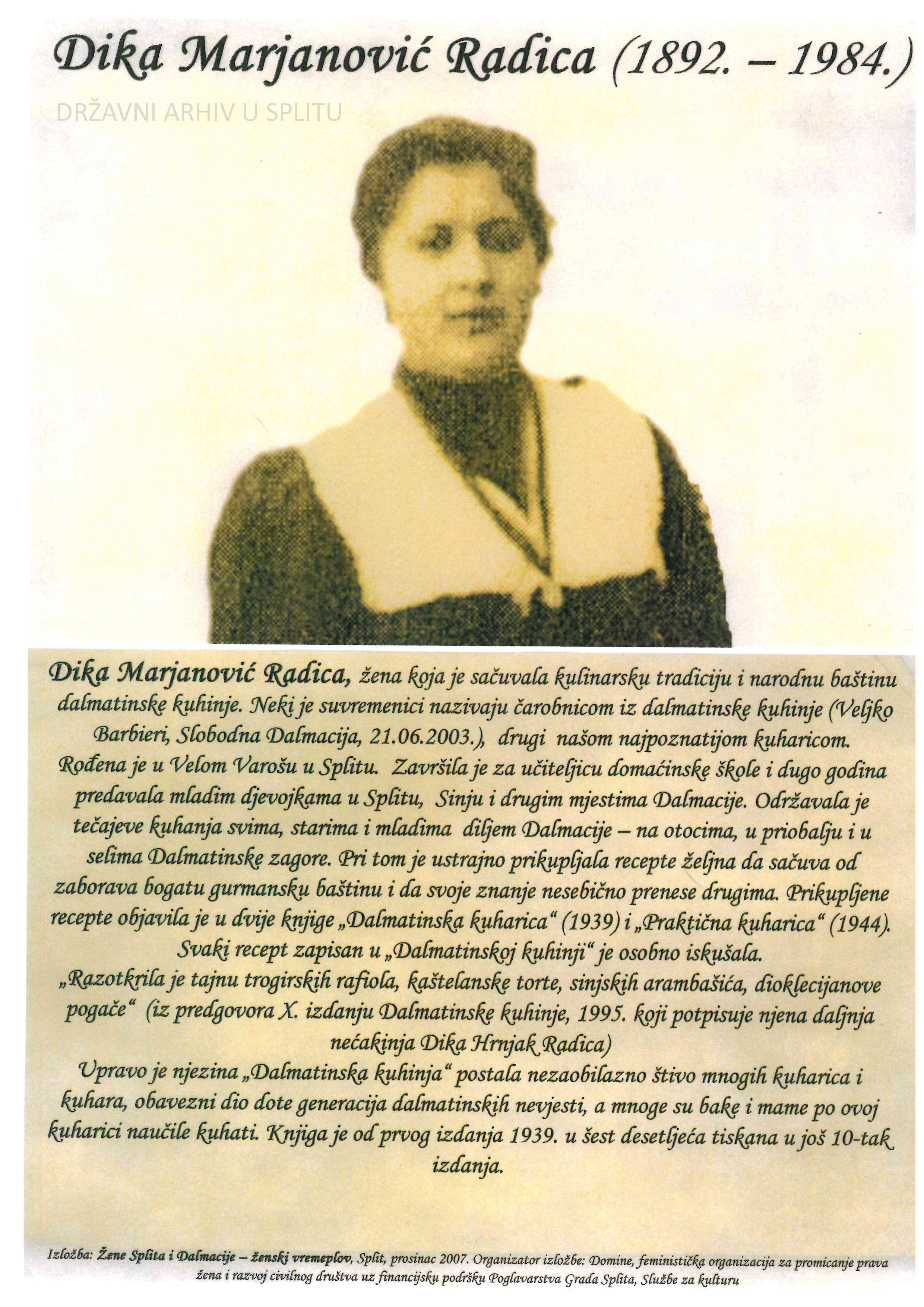 Udruga “Domine” iz Splita, organizacija za promicanje ženskih prava koja djeluje u Splitu od 2002. g. s ciljem osnaživanja žena i promicanja ravnopravnosti žena i muškaraca, organizirala je 2007. g. izložbu “Žene Splita i Dalmacije – ženski vremeplov” koja obuhvaća portrete 15 znamenitih žena iz prošlosti Dalmacije i grada Splita – od Priske i Valerije do naših suvremenica poput Asje Kisić, Cate Dujšin, Ane Roje i dr. U sklopu Zbirke plakata u Državnom arhivu u Splitu sačuvano je 12/15 plakata te je izabrano 5 plakata, skenirano i umanjeno kako bismo mogli na malom prostoru prikazati barem dio izvanredne izložbe. Izabrani su plakati Priske i Valerije, Dike Marjanović-Radica, Anke Berus, Ane Roje i Asje Kisić. Dodana je također i fotografija svjetski poznate balerine Ane Roje iz Zbirke fotografija te kuharica Dike Marjanović-Radica iz 1976. g.