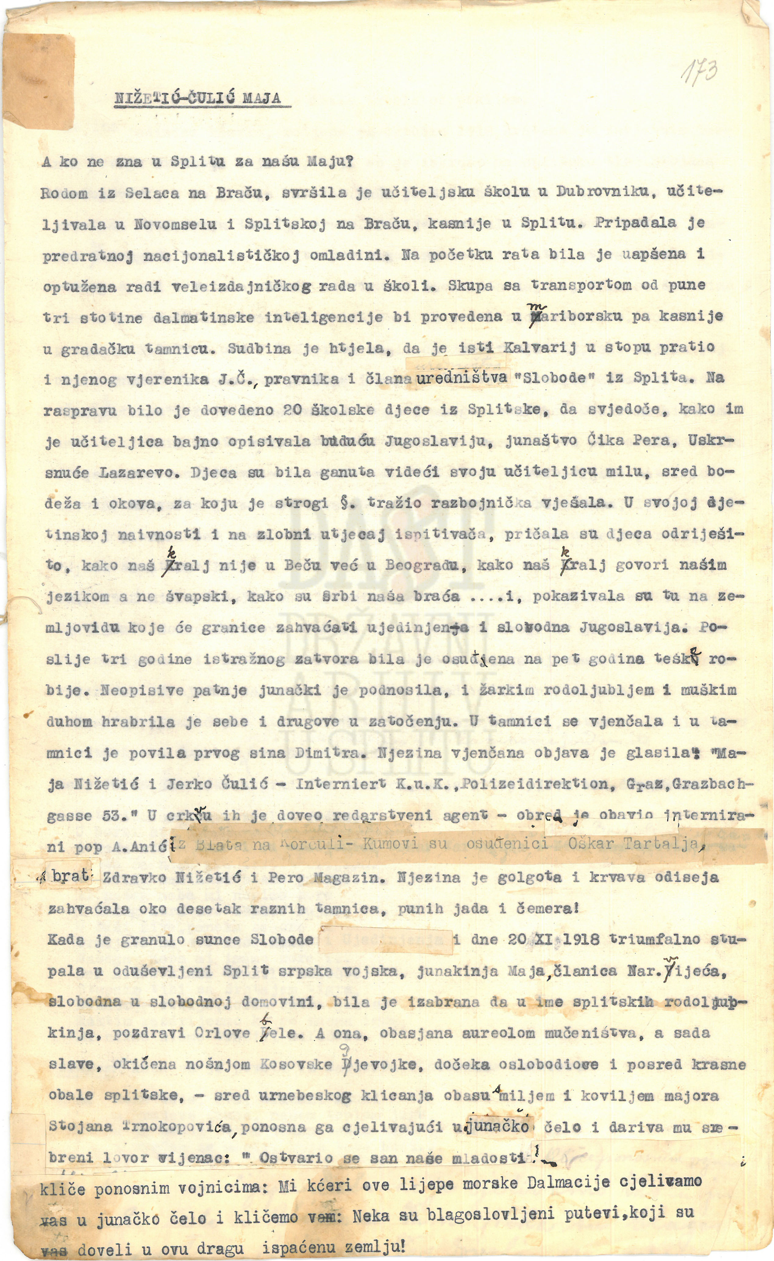 Fotografija se čuva kao prilog u neobjavljenoj knjizi Petra Kuničića, Učitelji djece u Dalmaciji, prosvjetitelji i perom, napisanoj 1940. godine. Majka na fotografiji je Maja Čulić, rođena Nižetić u Selcima na otoku Braču, 1891. godine. Autor o učiteljici započinje riječima „A ko ne zna u Splitu za našu Maju?“ Završila je Učiteljsku školu u Dubrovniku, učiteljevala u Novom Selu i Splitskoj na Braču, a kasnije u Splitu. Na početku Prvog svjetskog rata bila je uhićena i optužena radi veleizdajničkog rada u školi. U zatočeništvu se i udala, a imala je četvero djece, tri sina i kćer. Nakon rata, 1918. g. osnovala je u Splitu Žensku narodnu zadrugu koja je imala i humanitarnu sekciju sa savjetovalištem za majke. Umrla je u Zadru 1984. godine.