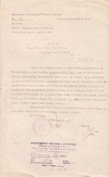 Posebno je zanimljiv doprinos Splita i Dalmacije ovom međunarodnom događaju. U siječnju 1924. godine, Trgovačka i obrtnička komora u Splitu zaprimila je dopis Ministarstva trgovine i industrije, kojim se od gospodina Kamila Tončića traži mišljenje o sudjelovanju dalmatinskih obrtnika i škola na izložbi. Time započinje bogata korespondencija s brojnim upravnim, obrazovnim i kulturnim institucijama – školama, poduzećima, obrtnicima, lokalnom samoupravom, kulturno-umjetničkim društvima i komorama – koje su iskazale interes za sudjelovanje na ovom prestižnom događaju.