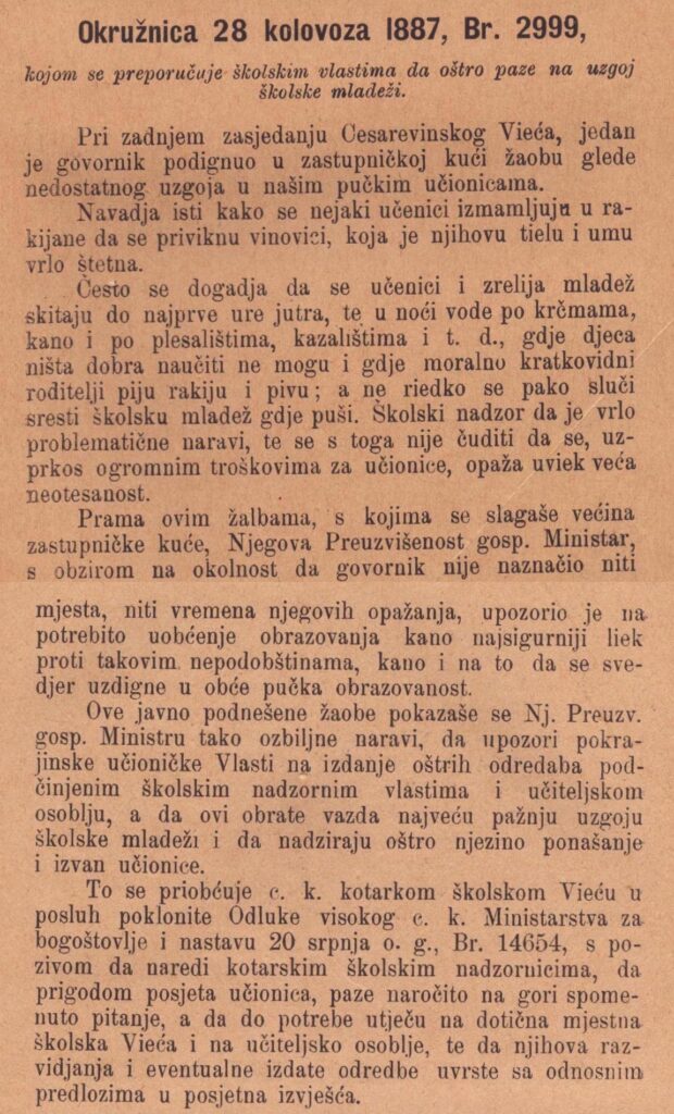 Na str. 553 Sbirke, u okružnici C. k. kotarskom školskom Vijeću, preporučuje se školskim vlastima da „oštro paze na uzgoj školske mladeži“ jer „često se dogadja da se učenici i zrelija mladež skitaju do najprve ure jutra, te u noći vode po krčmama, kano i po plesalištima, kazalištima i t. d., gdje djeca ništa dobra naučiti ne mogu i gdje moralno kratkovidni roditelji piju rakiju i pivu, a ne riedko se pako sluči sresti školsku mladež gdje puši.“ i o obrazovanju kao moćnome alatu protiv „takovih nepodobština“.