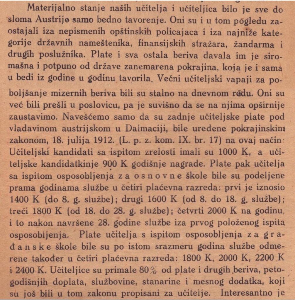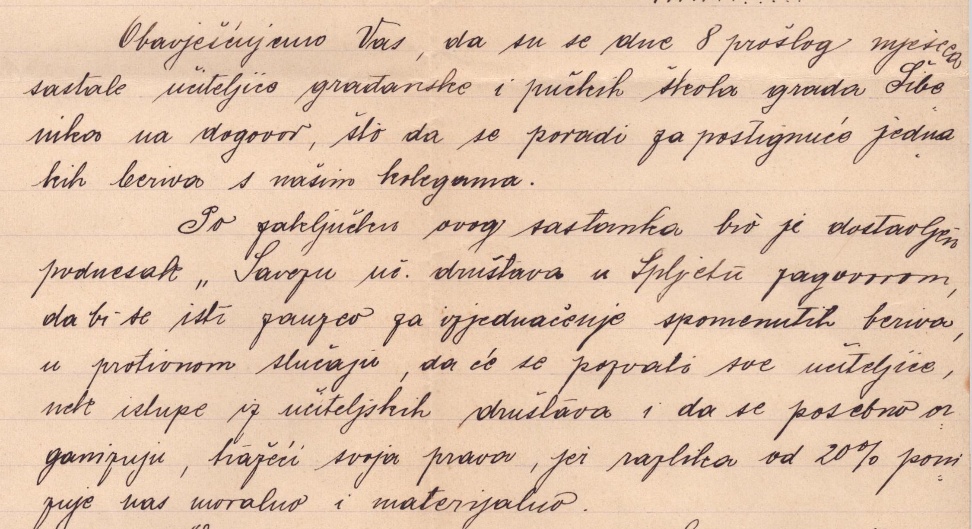 Tako u dopisu Savezu učiteljskih društava u Spljetu, od 18. ožujka, 1914., Odbor učiteljica grada Šibenika obavještava Savez da je na sastanku učiteljica građanskih i pučkih škola grada Šibenika raspravljano „što da se poradi za postignuća jednakih beriva s našim kolegama….jer nas razlika od 20% ponizuje moralno i materijalno“.