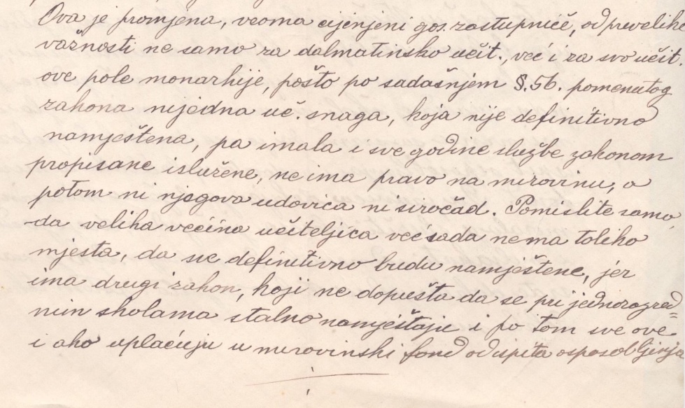 Kad govorimo o položaju učiteljstva početkom 20. st. spomenut ćemo još i činjenicu da učitelji, koji nisu imali stalan posao, nisu imali pravo na mirovinu, iako su uplaćivali sredstva u mirovinski fond za vrijeme trajanja službe. Naročito se to odnosilo na učiteljice u jednorazrednim školama za koje zakonom nije bilo ni predviđeno stalno namještenje. O svemu tome svjedoči nam pismo Saveza dalmatinskih učiteljskih društava narodnom zastupniku Jurju Biankiniju od 15. siječnja 1913. g. u kojem ga se moli da urgira u parlamentu u preinaci spornog paragrafa školskog zakona iz 1869. g.