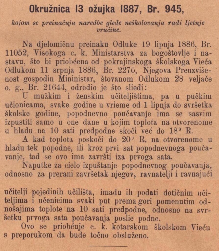 O tome svjedoči ministarska odluka 1887. g. glede „poučavanja u pučkim učionicama i učiteljištima u vrieme ljetne vrućine“ prema kojoj se poslijepodnevna nastava nije održavala ukoliko je vanjska jutarnja temperatura izmjerena u 10h iznosila minimalno 22.5 stupnjeva Celzijusovih.